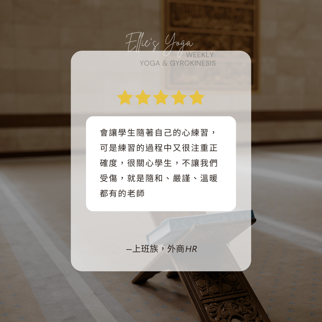 教室備有瑜伽磚與輔具,之後會請妳準備自己喜歡的瑜伽墊,讓練習充滿儀式感